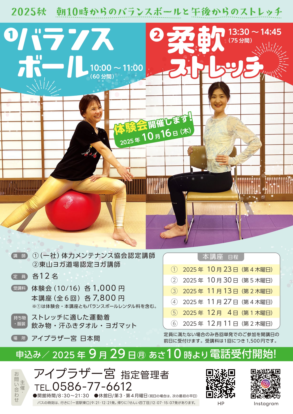 お知らせ アイプラザ一宮からのお知らせです。 自主事業「はじめての太極拳 2」満員御礼の情報をアップしました。 2025年10月10日 自主事業「愛・LOVEアニマルアートワークショップ」情報のアップをしました 2025年09月28日 自主事業「楽しく歌おう懐メロ俱楽部」の情報をアップしました。 2025年09月28日 自主事業「柔軟ストレッチ」の情報をアップしました。 2025年09月23日 自主事業「バランスボール」の情報をアップしました。 2025年09月23日 自主事業「はじめての太極拳 2」の情報をアップしました。 2025年09月21日 自主事業 「中垣哲也 オーロラ上映&トークライブ」の情報をアップしました。 2025年09月20日 自主事業 アイプラザ一宮上映会「人生フルーツ」の情報をアップしました。 2025年09月17日 講堂(大ホール)廃止のお知らせ 2025年05月31日 体育室 WEB抽選方式開始に向けてのご案内 第5弾!!利用許可書について 2025年05月01日