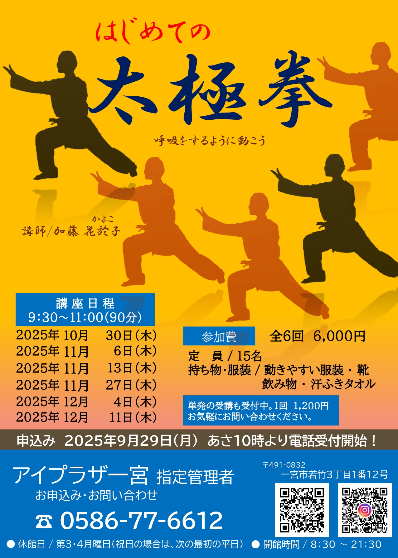 お知らせ アイプラザ一宮からのお知らせです。 自主事業「はじめての太極拳 2」満員御礼の情報をアップしました。 2025年10月10日 自主事業「愛・LOVEアニマルアートワークショップ」情報のアップをしました 2025年09月28日 自主事業「楽しく歌おう懐メロ俱楽部」の情報をアップしました。 2025年09月28日 自主事業「柔軟ストレッチ」の情報をアップしました。 2025年09月23日 自主事業「バランスボール」の情報をアップしました。 2025年09月23日 自主事業「はじめての太極拳 2」の情報をアップしました。 2025年09月21日 自主事業 「中垣哲也 オーロラ上映&トークライブ」の情報をアップしました。 2025年09月20日 自主事業 アイプラザ一宮上映会「人生フルーツ」の情報をアップしました。 2025年09月17日 講堂(大ホール)廃止のお知らせ 2025年05月31日 体育室 WEB抽選方式開始に向けてのご案内 第5弾!!利用許可書について 2025年05月01日